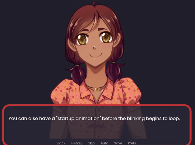 The second feature is that you can have "startup" animations before the blink begins looping. Do you have a wink animation that you want to wink once, then blink with both eyes on a normal expression? Do you want to show a character having a split second of surprise before looking away? Now you can do that! You can specify the start frame for looping via loop_start_frame. As before, there are examples both in the new files and on my website via the link above.
