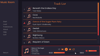 Easily include a custom music room in Ren'Py for players to listen to the game soundtrack. This code builds off of Ren'Py's built-in Music Room system, and does not require any additional libraries to work.