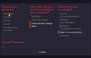 If you haven't already, take a look at my In-Depth Pronouns for Ren'Py code, which is completely free!